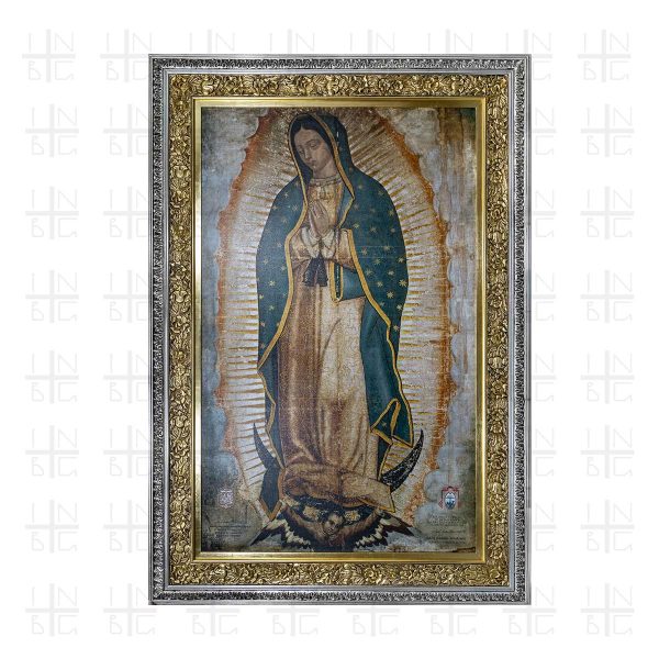 Cuadro replica de nuestra Señora de Guadalupe en madera de pino, compuesto por 4 molduras con aplicaciones, laminado en hoja de oro/plata.