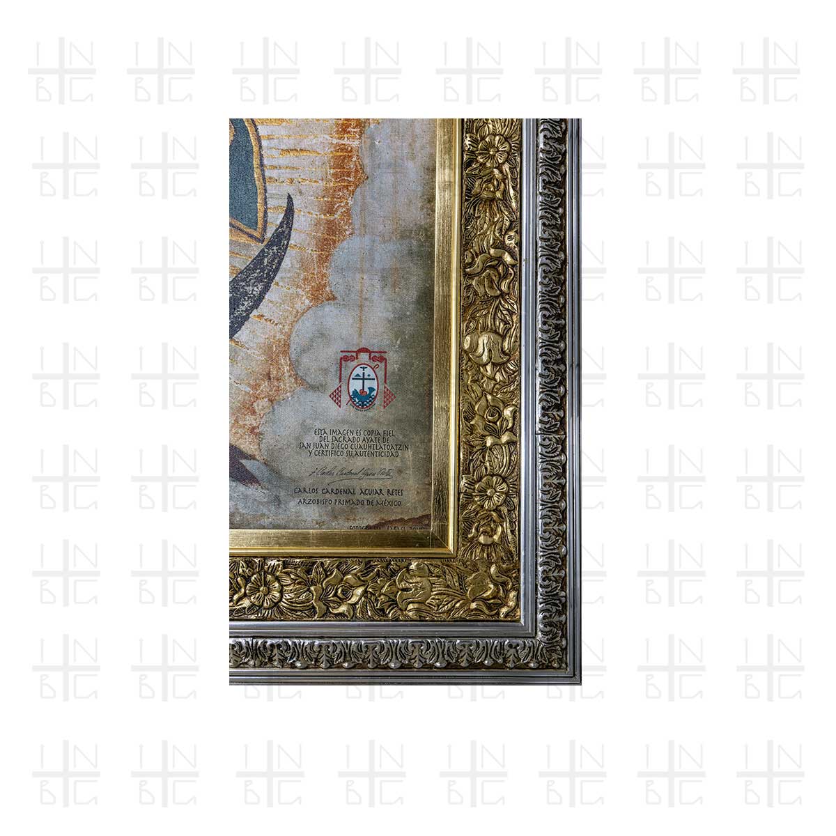 Copia fiel certificada del sagrado ayate de San Juan Diego por el Arzobispo Primado de la ciudad de México y el Rector de la Insigne Nacional Basílica de Guadalupe.